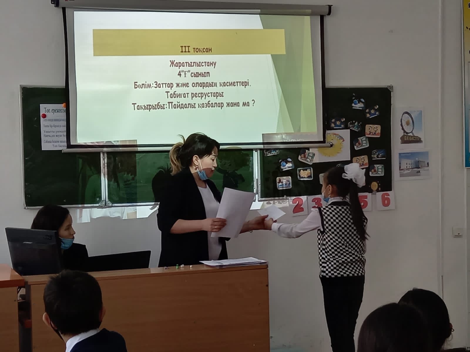 4«А»сынып жетекшісі: Ж.Таймағамбетова жаратылыстану пәнінен «Неліктен әр жануардың тамағы әр түрлі болады?»тақырыбында ашық сабақ өткізді. Мұғалім өз сабағын «Мен ақылды баламын» атты психологиялық дайындықпен бастап, қима қағаздар арқылы 2 топқа бөлуден бастады. Үй тапсырмасын сұрау кезінде «Кезектескен интерьвю» әдісін қолданды.Сабағында дүниетану мен қазақ тілі пәнімен байланыс болды.Интернет-ресурстар, дерекқордан сабаққа қатысты ақпараттарды пайдаланды.«Тақырыпты болжау» және «Түртіп алу» әдістерін пайдаланды. Оқушылар қызығып, сабаққа белсене қатысты. Сабақ жоғарғы дәрежеде өтті.Қатысқан мұғалімдер өте жақсы пікірлер қалдырды.