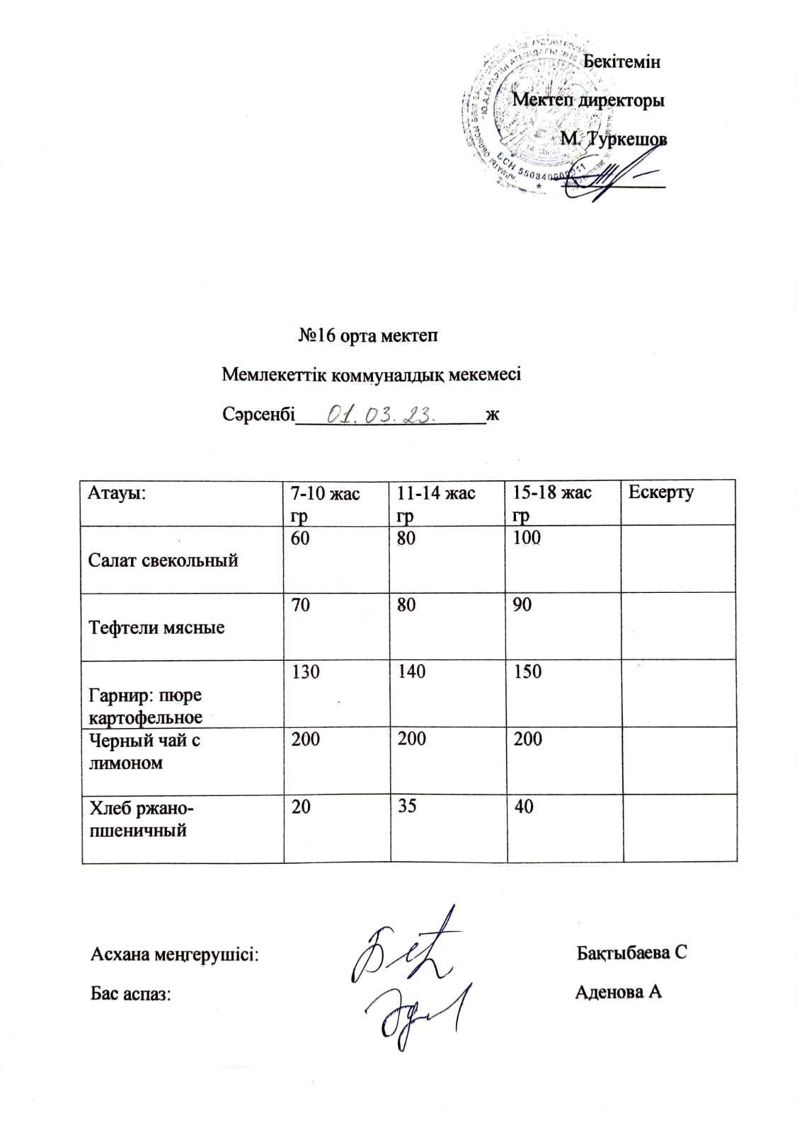 Меню 01.03.23 » №16 ОРТА МЕКТЕП