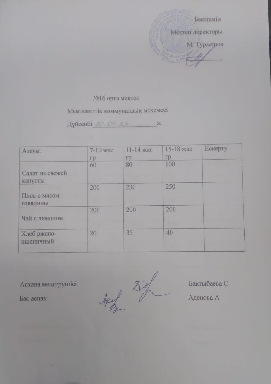 Меню 10.04.2023 » №16 ОРТА МЕКТЕП