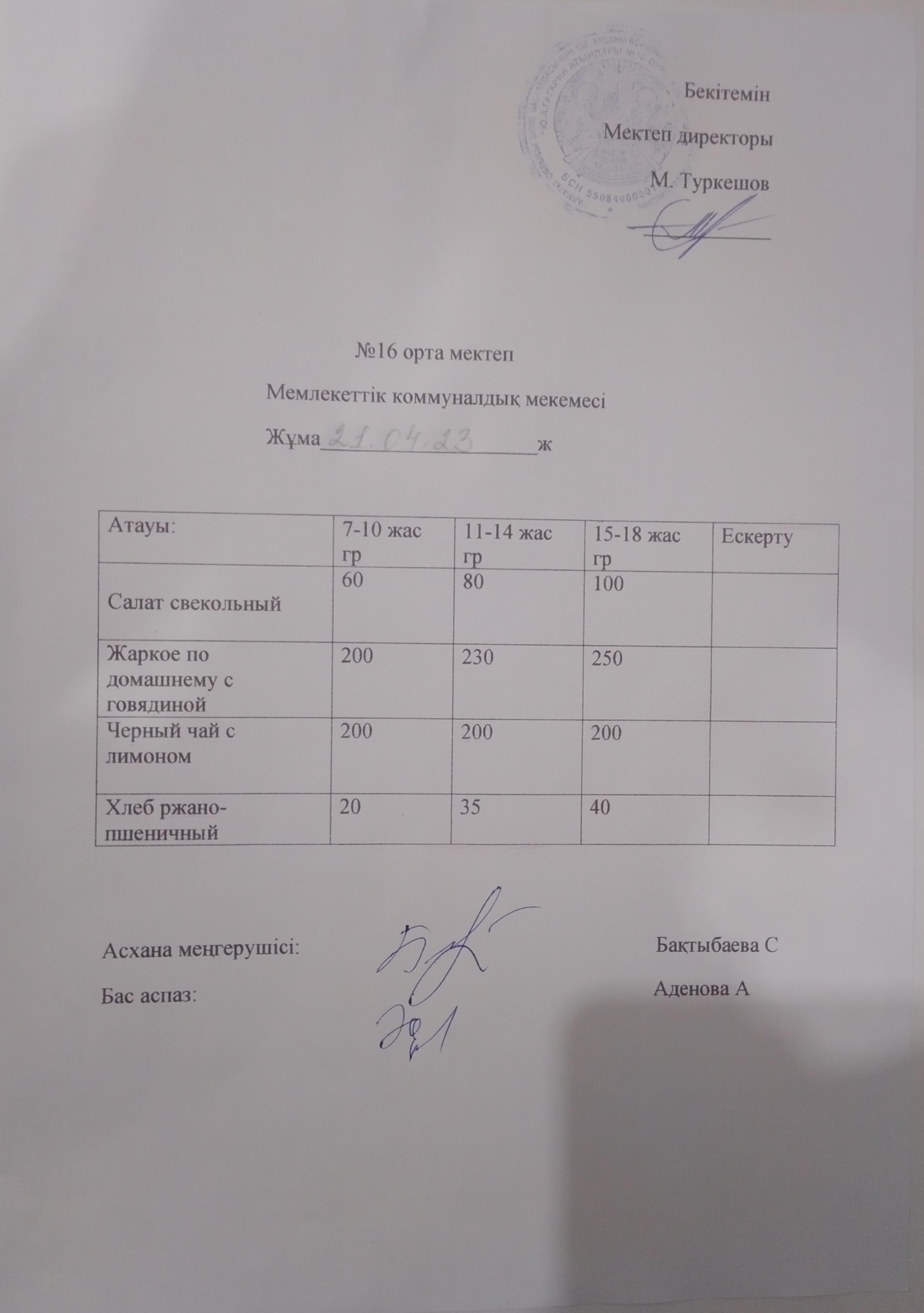 Меню 21.04.23 » №16 ОРТА МЕКТЕП