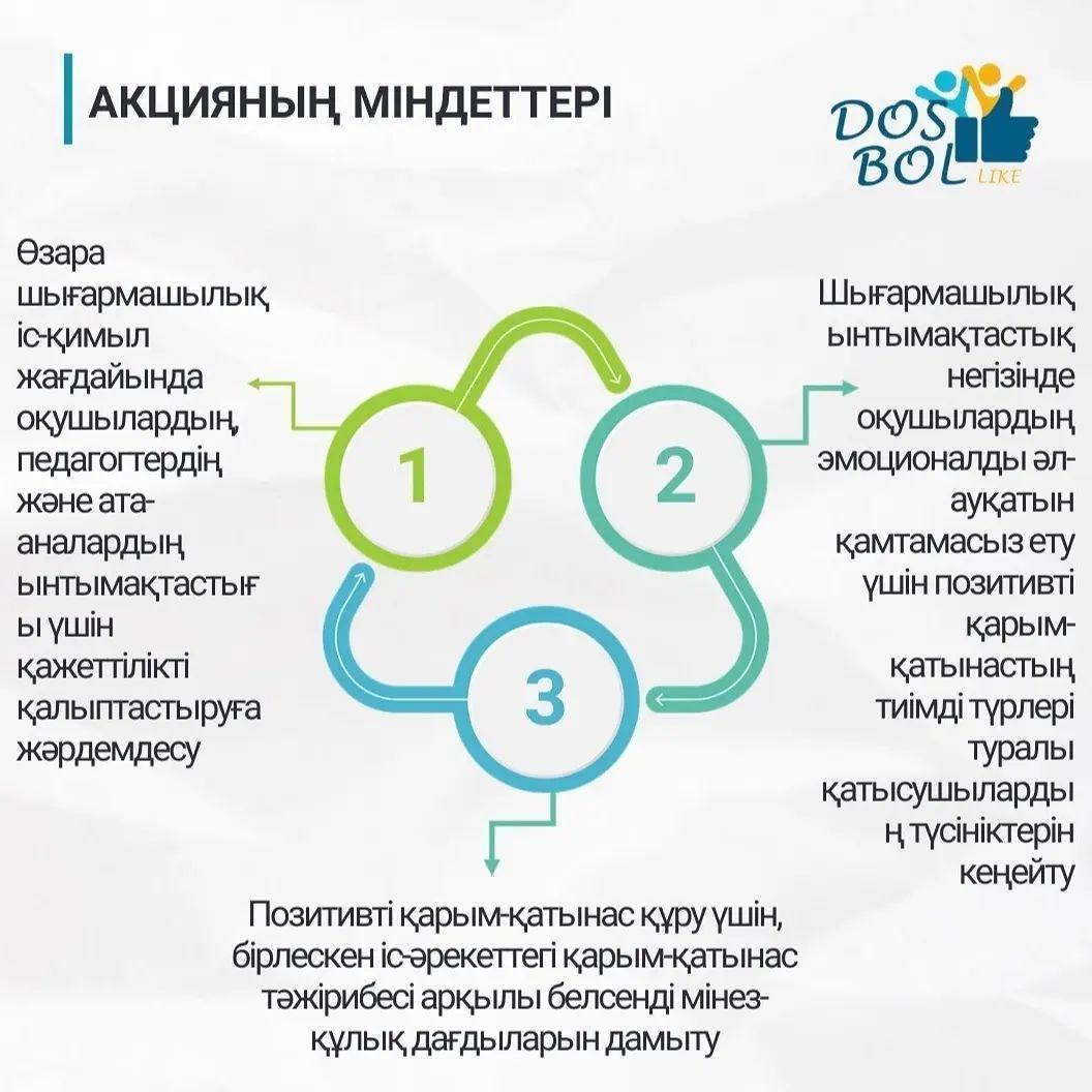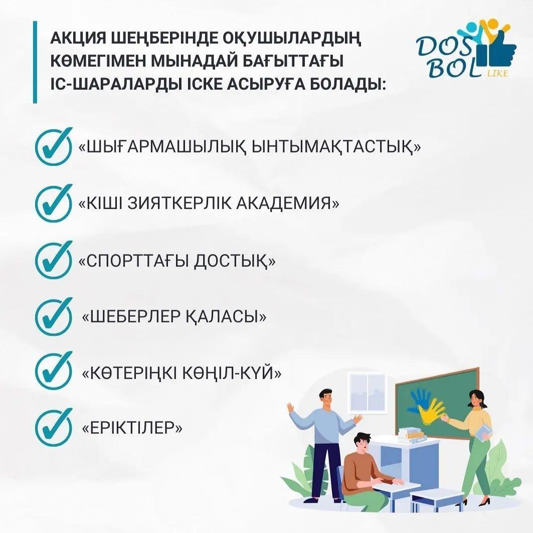 Құрметті ұстаздар мен оқушылар, ата—аналар! "ДОСБОЛlike: Достық қолын ұсын" акциясының басталғанын хабарлаймыз! Нағыз досыңның болғанын қаласаң— дос бол!!!