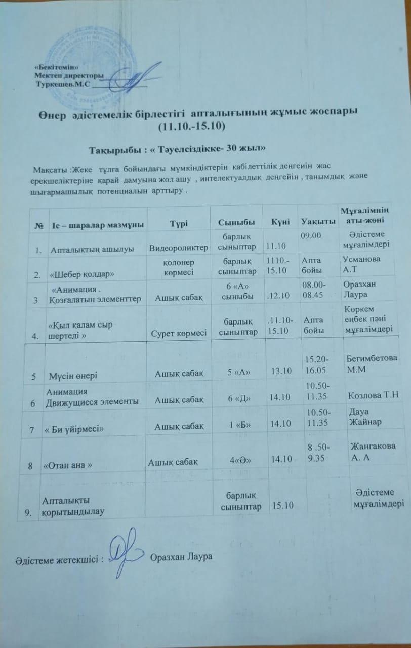 Осы мақсатты орындауда 1 тоқсанның 11.10-15.10.2021ж күндері аралығында Тәуелсіздіктің 30 жылдығына орай « Тәуелсіздікке -30 жыл » тақырыбы аясында апталық жұмыс жоспары бекітіліп ,өткізілді .