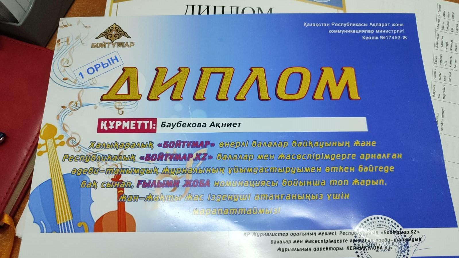 Халықаралық "Бойтұмар" өнерлі балалар байқауының жеңімпазы 10б сынып оқушысы Баубекова Ақниет 1 орынға иеленді. Жетекшісі Арыстанбаева Г.К. құттықтаймын!