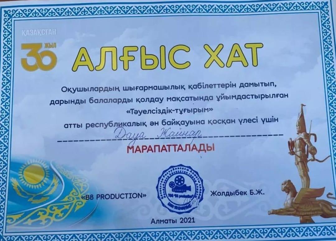 Оқушылардың шығармашылық қабілеттерін дамытып дарынды балаларды қолдау мақсатында ұйымдастырылған "Тәуелсіздік тұғырым" атты республикалық ән байқауына қосқан үлесі үшін Дауа Жайнар марапатталады.