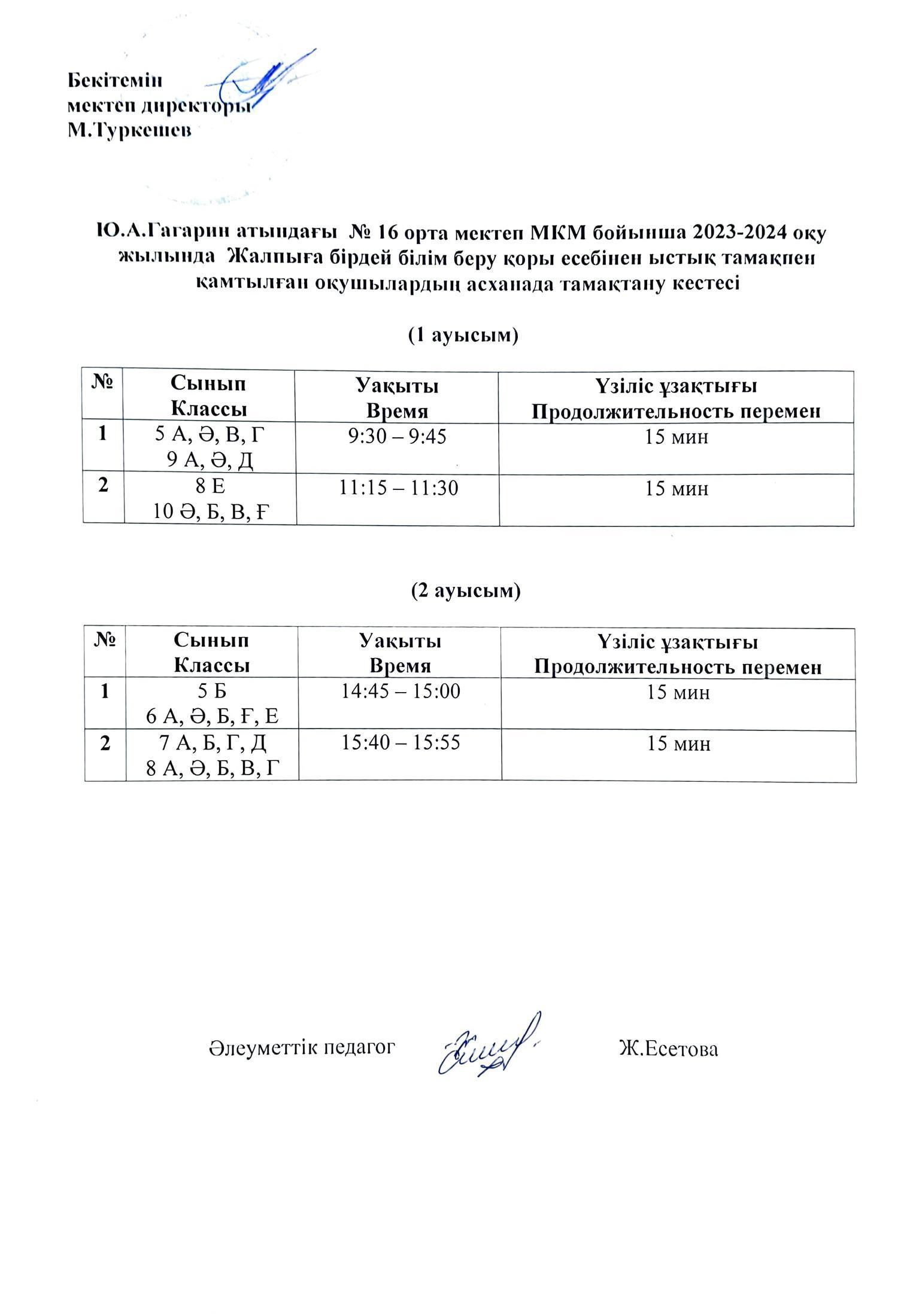Оқушылардың тамақтану кестесі » №16 ОРТА МЕКТЕП