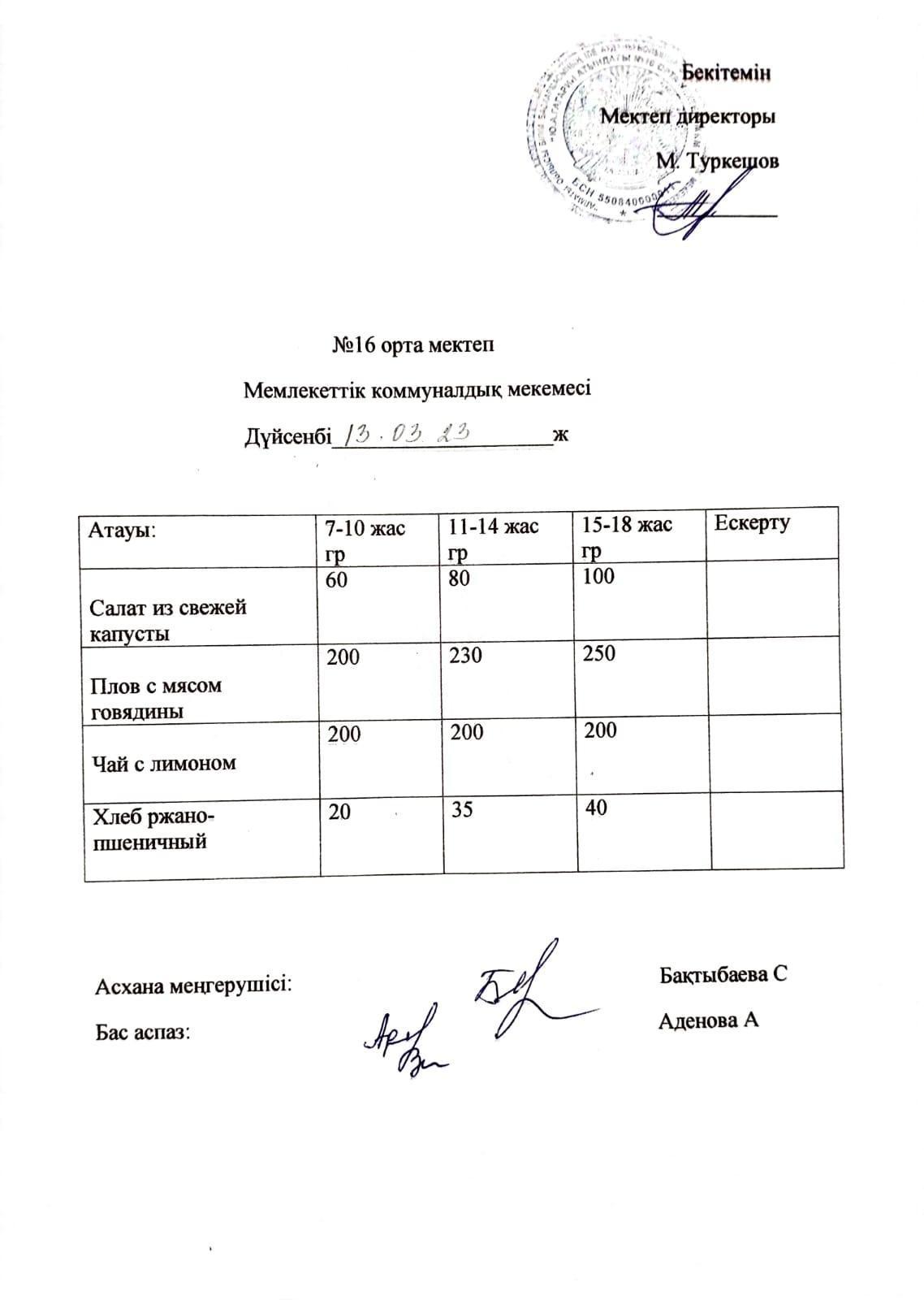 Меню 13.03.23 » №16 ОРТА МЕКТЕП